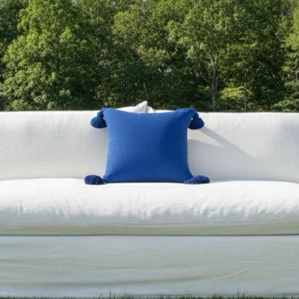 Almohadón lino azul Francia con 4 borlas en cada punta.