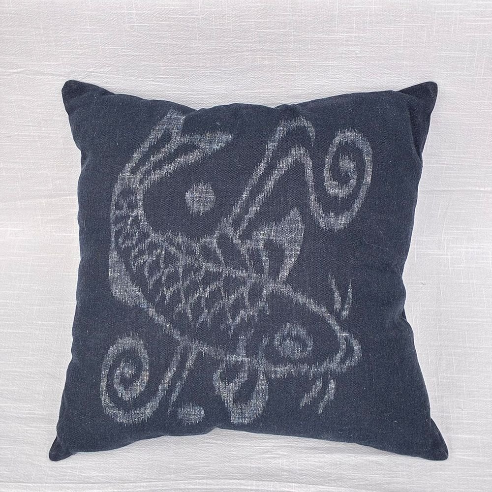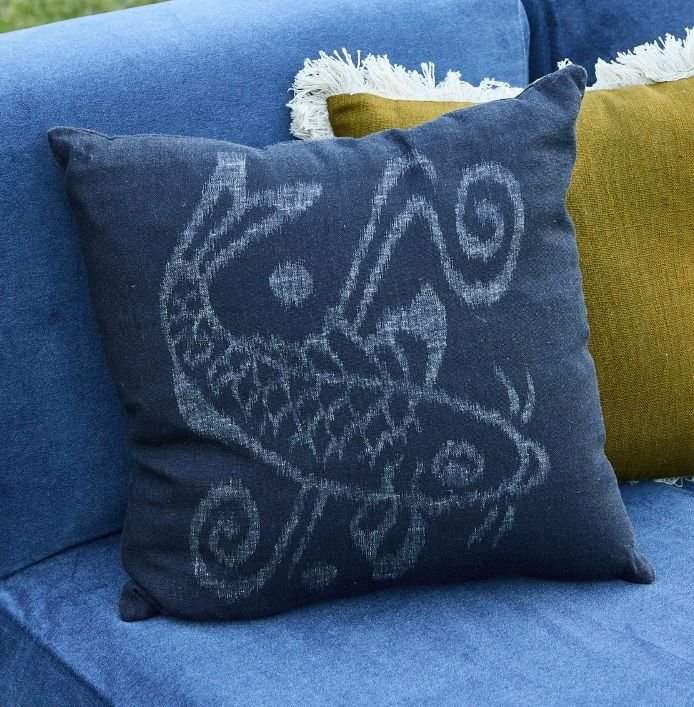 Almohadón cuadrado de lino azul oscuro con estampa de pez.