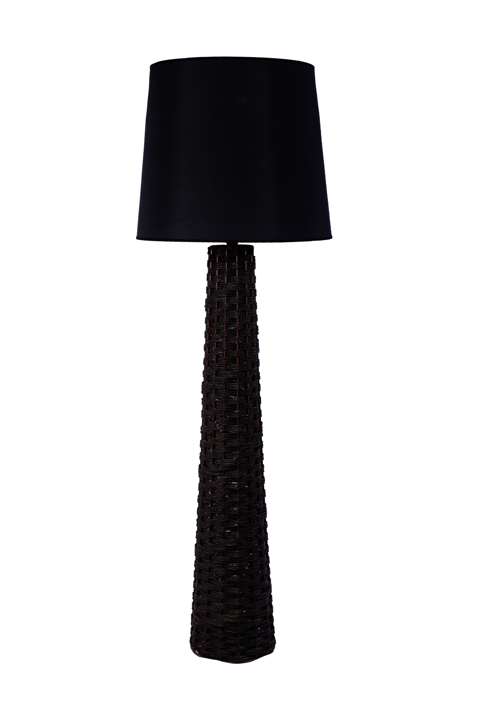 Lámpara de pie con pantalla negra y base de rattan natural negro o natural c/ foco vintage.