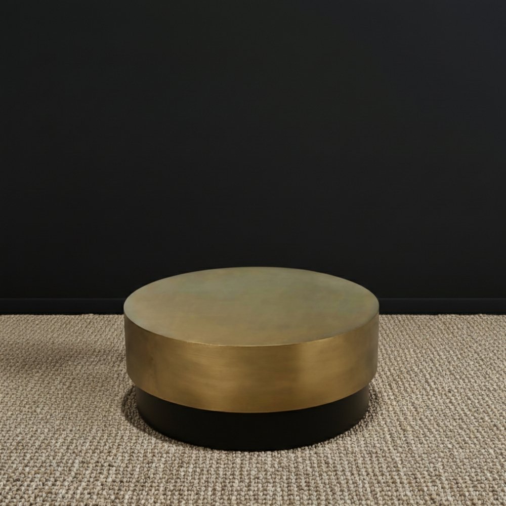 Mesa circular base negra y tapa dorada.