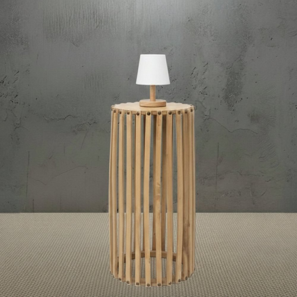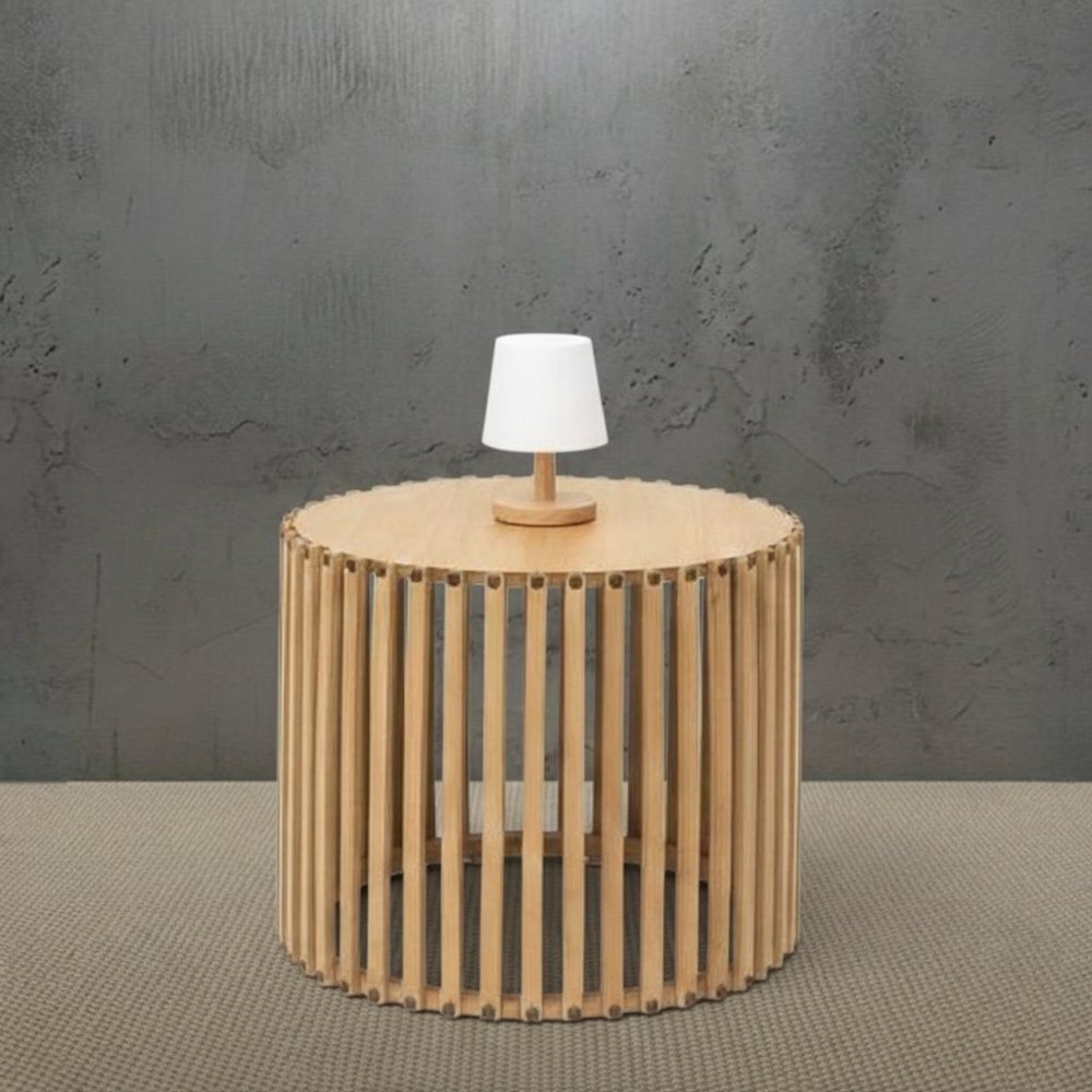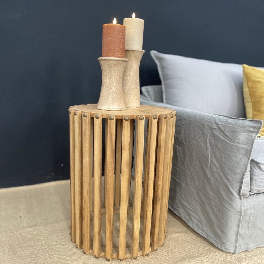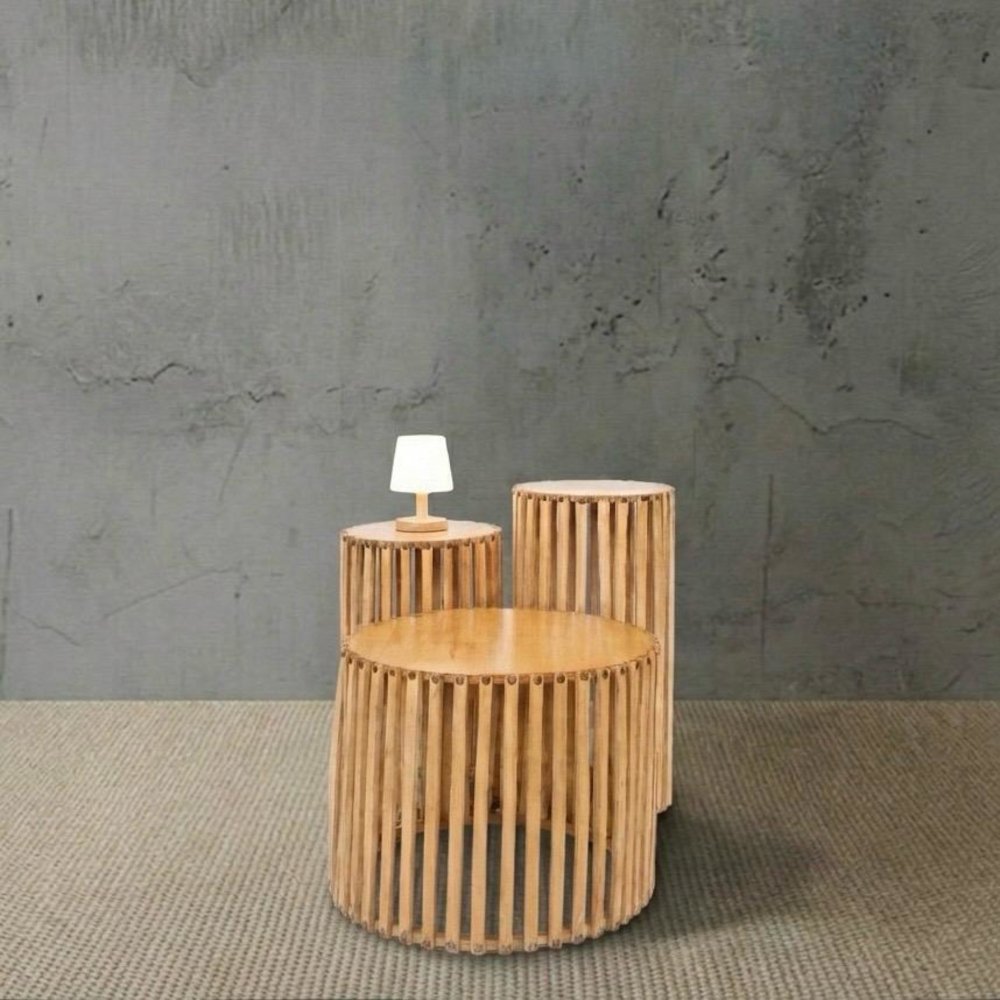 Mesa redonda con varillado de madera natural en 3 medidas: