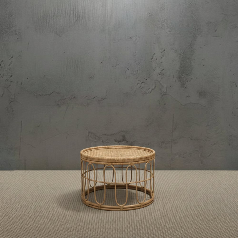Mesa redonda con diseño en caña y tapa en rattan en 3 medidas: