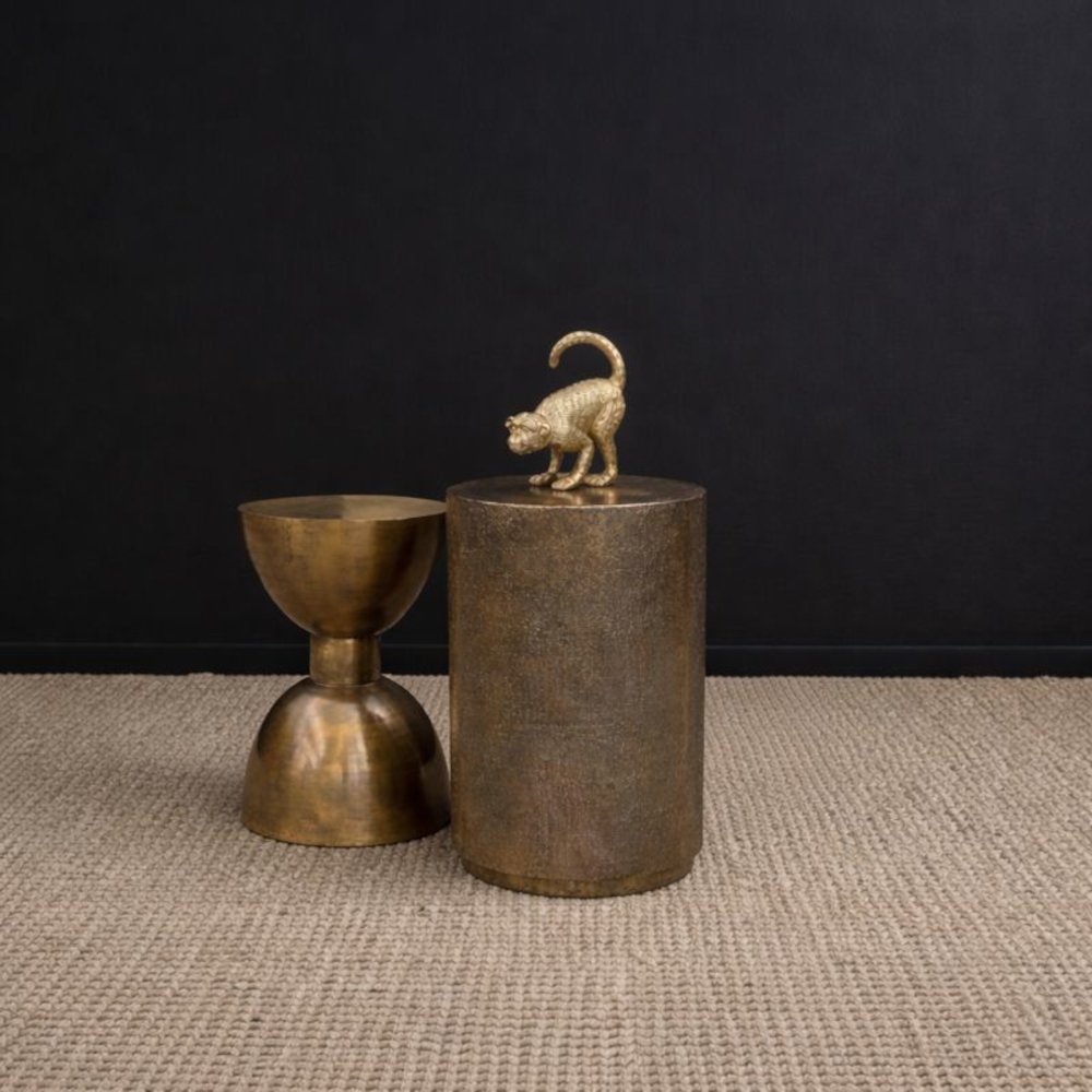Mesa auxiliar metálica circular color bronce viejo.
