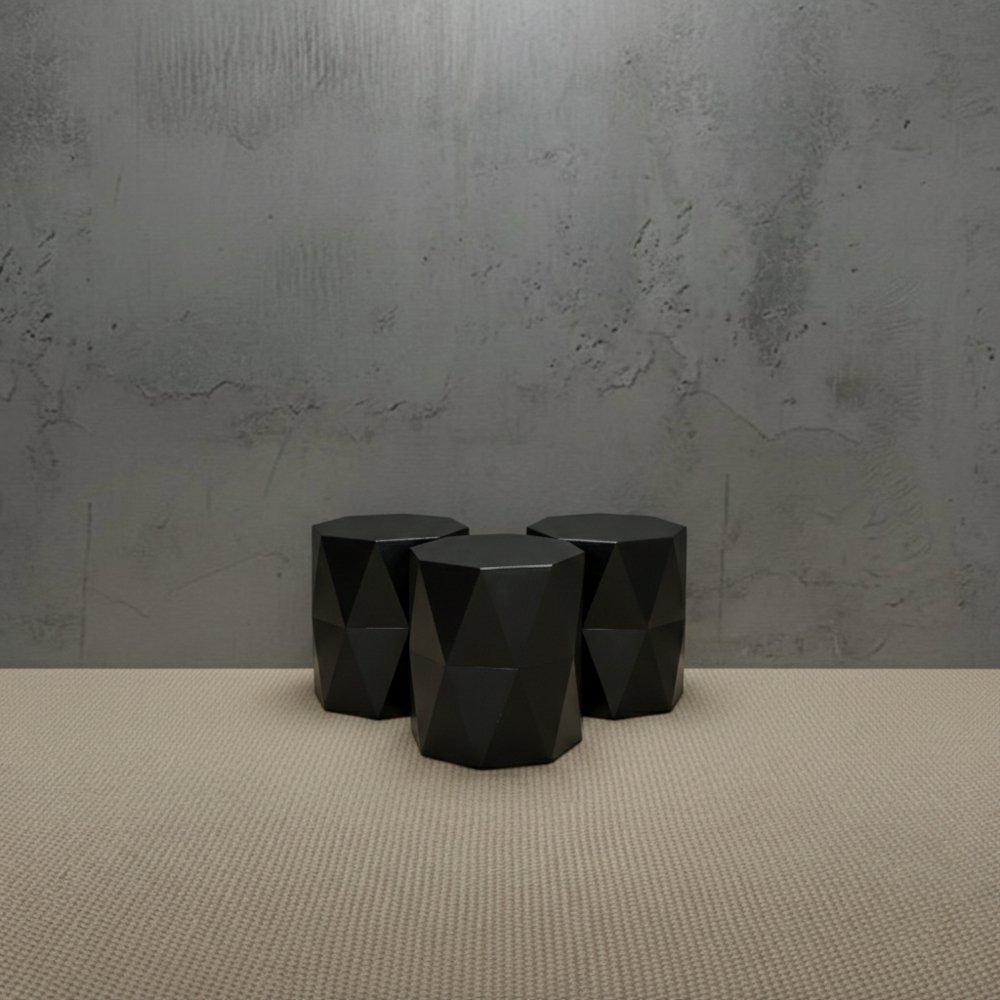 Mesa / Taburete de metal y trama geométrica en color negro.